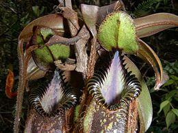 The pitcher mouth is often distinctly rhomboid in shape, but may also be oval[4] or elliptic. It has a highly oblique insertion and is concave when viewed in profile. The mouth rises at the rear to form a tapered neck, which may be held upright or be inclined forward over the pitcher orifice. The species is noted for having possibly the most developed peristome in the genus. It is cylindrical to slightly flattened,[7] glossy, rigid, and up to 5 mm wide (excluding the teeth). It consists of expanded ribs up to 6 mm high and spaced up to 5 mm apart. The entire flanges can measure up to 15 mm in length, although their size and number differ between populations[4] (a typical number being approximately 20 on each side of the orifice). These flanges form exceptionally long, incurved teeth at the inner edge of the pitcher orifice. The teeth are sickle-shaped (falcate) and extend approximately 7 mm into the interior, as measured from the inner edge of the peristome to the tooth apex. The outer edge of the peristome is entire, with the recurved flanges extending for around 2 mm past the rim. The teeth of the neck may assume a dagger-like shape and measure up to 10 mm by 2 mm.[7] These uppermost teeth are often noticeably splayed forward.[4]