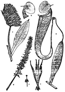 Upper pitchers arise gradually from the end of the tendril. They are very narrowly infundibular in the lower half to three-quarters. Above the hip, they are either cylindrical or narrowly infundibular. Aerial pitchers are much larger than their terrestrial counterparts, growing to 26 cm in height and 4.5 cm in width.[4] They usually have ribs in place of wings, although fringe elements may be present near the peristome. The glandular region covers the inner surface below the hip. The pitcher mouth is round and has a steeply oblique insertion. The peristome is cylindrical and up to 3 mm wide. Other parts of the upper pitchers are similar to those of the lower pitchers.[2]
