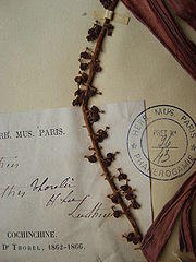 The first known collection of N. thorelii was made by Clovis Thorel between 1862 and 1866[5] from Ti-tinh, Lo-thieu, Guia-Toan, Vietnam.[6] During this time, Thorel collected a number of specimens of N. thorelii, all of which have been designated as Thorel 1032. One of these specimens, the lectotype, is a male plant with lower pitchers. It is deposited at the Museum National d'Histoire Naturelle in Paris, together with one isotype: a female specimen with upper pitchers. A second isotype is held at Herbarium Bogoriense (BO), the herbarium of the Bogor Botanical Gardens.[6] An additional specimen of Thorel 1032 is deposited at the New York Botanical Garden.[5]