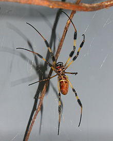 Trichonephila clavipes (formerly known as Nephila clavipes), commonly known as the golden silk orb-weaver, golden silk spider, or banana spider, is an orb-weaving spider species which inhabits forests and wooded areas ranging from the southern US to Argentina.[2] In fact, it is the only species of the genus Trichonephila indigenous to continental North and South America. Known for the golden color of their silk, the large size of their females, and their distinctive red-brown and yellow coloring, T. clavipes construct large, asymmetrical circular webs attached to trees and low shrubs in woods to catch small- and medium-size flying prey, mostly insects. They are excellent web-builders, producing and utilizing seven different types of silk,[3] and they subdue their prey by injecting them with venom, as opposed to related species which immobilize their prey by wrapping them in silk first. They are not known to be aggressive towards humans, only biting out of self-defense if touched, and their relatively harmless venom has a low toxicity, posing little health concern to healthy human adults. Due to their prevalence in forests, T. clavipes may be encountered by hikers.