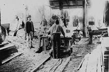 The township of Nerang was surveyed by Martin Lavelle in June 1865.[5] Lavelle named a street after himself and others after local pioneers like William White the local squatter, and Edmund Price the local planter. Nerang has focused very much on the river crossing and the head of navigation. Land was first sold here in 1871. Daily Cobb & Co coach services from Brisbane began the same year[6] and river transport to the settlement became more regular. Benjamin Cockerill erected the first hotel, The Nerang, in early 1872. The population of the 'town' of Nerang in the 1871 census was too small even to be included in the list of towns in the region. A thrice weekly Cobb & Co coach service provided the incentive for the opening of a second hotel called the Southern Cross, followed by the Royal Mail in 1873. With an abundant supply of red cedar amongst other tree species, the first industry to flourish in the area was timber cutting.