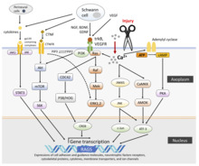 Immediately following injury, neurons undergo a large number of transcriptional and proteomic changes which switch the cell from a mature, synaptically active neuron to a synaptically silent, growth state. This process is dependent on new transcription, as blocking the ability of cells to transcribe new mRNA severely impairs regeneration. A number of signaling pathways have been shown to be turned on by axon injury and help to enable long distance regeneration including BMP, TGFβ, and MAPKs. Similarly, a growing number of transcription factors also boost the regenerative capacity of peripheral neurons including ASCL1, ATF3, CREB1, HIF1α, JUN, KLF6, KLF7, MYC, SMAD1, SMAD2, SMAD3, SOX11, SRF, STAT3, TP53, and XBP1. Several of these can also boost the regenerative capacity of CNS neurons, making them potential therapeutic targets for treating spinal cord injury and stroke.[3]