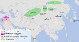 The complete disappearance of the Nestorian dioceses in Central Asia probably stemmed from a combination of persecution, disease, and isolation: "what survived the Mongols did not survive the Black Death of the fourteenth century."[89] In many parts of Central Asia, Christianity had died out decades before Timur's campaigns. The surviving evidence from Central Asia, including a large number of dated graves, indicates that the crisis for the Church of the East occurred in the 1340s rather than the 1390s. Several contemporary observers, including the Papal Envoy Giovanni de' Marignolli, mention the murder of a Latin bishop in 1339 or 1340 by a Muslim mob in Almaliq, the chief city of Tangut, and the forcible conversion of the city's Christians to Islam. Tombstones in two East Syriac cemeteries in Mongolia have been dated from 1342, some commemorating deaths during a Black Death outbreak in 1338. In China, the last references to Nestorian and Latin Christians date from the 1350s, shortly before the replacement in 1368 of the Mongol Yuan dynasty with the xenophobic Ming dynasty and the consequential self-imposed isolation of China from foreign influence including Christianity.[92]