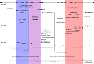 Nestorianism is a Christological doctrine that emphasises the distinction between the human and divine natures of Jesus. It was attributed to Nestorius, Patriarch of Constantinople from 428 to 431, whose doctrine represented the culmination of a philosophical current developed by scholars at the School of Antioch, most notably Nestorius's mentor Theodore of Mopsuestia, and stirred controversy when he publicly challenged the use of the title Theotokos (literally, "Bearer of God") for Mary, mother of Jesus,[24] suggesting that the title denied Christ's full humanity. He argued that Jesus had two loosely joined natures, the divine Logos and the human Jesus, and proposed Christotokos (literally, "Bearer of the Christ") as a more suitable alternative title. His statements drew criticism from other prominent churchmen, particularly from Cyril, Patriarch of Alexandria, who had a leading part in the Council of Ephesus of 431, which condemned Nestorius for heresy and deposed him as Patriarch.[25]