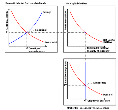 NCO is linked to the market for loanable funds and the international foreign exchange market. This relationship is often summarized by graphing the NCO curve with the quantity of country A's currency in the x-axis and the country's domestic real interest rate in the y-axis. The NCO curve gets a negative slope because an increased interest rate domestically means an incentive for savers to save more at home and less abroad.