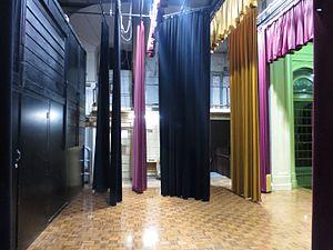 A curtain is a piece of cloth intended to block or obscure light, or drafts, or (in the case of a shower curtain) water.[1] A curtain is also the movable screen or drape in a theater that separates the stage from the auditorium or that serves as a backdrop/background .[1]