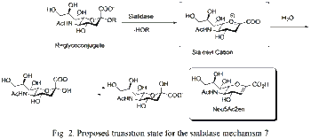 The enzymatic mechanism of influenza virus sialidase has been studied by Taylor et al., shown in Figure 1. The enzyme catalysis process has four steps. The first step involves the distortion of the α-sialoside from a 2C5 chair conformation (the lowest-energy form in solution) to a pseudoboat conformation when the sialoside binds to the sialidase. The second step leads to an oxocarbocation intermediate, the sialosyl cation. The third step is the formation of Neu5Ac initially as the α-anomer, and then mutarotation and release as the more thermodynamically-stable β-Neu5Ac.[11]