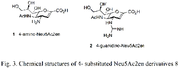 Many Neu5Ac2en-based compounds have been synthesized and tested for their influenza virus sialidase inhibitory potential. For example: The 4-substituted Neu5Ac2en derivatives (Figure 3), 4-amino-Neu5Ac2en (Compound 1), which showed two orders of magnitude better inhibition of influenza virus sialidase than Neu5Ac2en5 and 4-guanidino-Neu5Ac2en (Compound 2), known as Zanamivir, which is now marketed for treatment of influenza virus as a drug, have been designed by von Itzstein and coworkers.[15] A series of amide-linked C9 modified Neu5Ac2en have been reported by Megesh and colleagues as NEU1 inhibitors.[16]