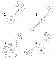 Neurons vary in shape and size and can be classified by their morphology and function.[11] The anatomist Camillo Golgi grouped neurons into two types; type I with long axons used to move signals over long distances and type II with short axons, which can often be confused with dendrites. Type I cells can be further classified by the location of the soma. The basic morphology of type I neurons, represented by spinal motor neurons, consists of a cell body called the soma and a long thin axon covered by a myelin sheath. The dendritic tree wraps around the cell body and receives signals from other neurons. The end of the axon has branching axon terminals that release neurotransmitters into a gap called the synaptic cleft between the terminals and the dendrites of the next neuron.