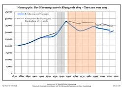 Development of population since 1875 within the current Boundaries (Blue Line: Population; Dotted Line: Comparison to Population development in Brandenburg state; Grey Background: Time of Nazi Germany; Red Background: Time of communist East Germany)