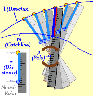Point P is called the pole of the neusis, line l the directrix, or guiding line, and line m the catch line. Length a is called the diastema (διάστημα; Greek for "distance").