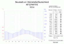 However, this climate chart is from a weather station at 161 m above NN in the subdistrict of Haardt above the town, which is 25 metres lower. So the values differ, with temperatures being a little lower and rainfall higher. The chart shows an annual average temperatures of 10.1 °C (50.2 °F) to 18.4 °C (65.1 °F) in the summer months dropping 1.7 °C (35.1 °F) during the winter. Its annual precipitation measured 614 mm (24.2 in).