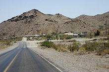 SR 165 begins at a junction with US 95 approximately 10 miles (16 km) south of Boulder City. From there, the state highway follows Nelson Road in a southeasterly direction through Eldorado Valley 11 miles (18 km) to its end just outside the town of Nelson.[1][2] The town of Nelson was established in 1905 following several mining claims being discovered in the valley. Although the small community is still inhabited, the remains of many mining operations and abandoned structures can still be seen in the vicinity.[3]