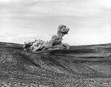 ![]() A November 1951 nuclear test at Nevada Test Site, Operation Buster–Jangle "Dog". It had a yield of 21 kilotons of TNT (88 TJ), and was the first U.S. nuclear field exercise conducted with live troops maneuvering on land. Troops shown are 6 mi (10 km) from the blast. | |