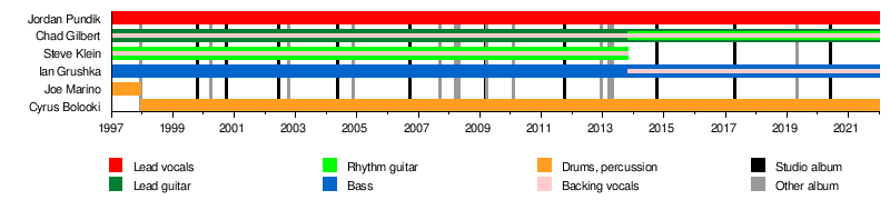 New Found Glory (formerly A New Found Glory)[1] is an American rock band from Coral Springs, Florida, formed in 1997. The band currently consists of Jordan Pundik (lead vocals), Ian Grushka (bass guitar), Chad Gilbert (lead guitar, backing vocals), and Cyrus Bolooki (drums).[2][3] Longtime rhythm guitarist and lyricist Steve Klein departed from the band in late 2013.[4][5][6] During their lengthy recording career, the band have released ten studio albums, one live album, two EPs, and four cover albums.