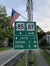 New Hampshire Route 87 is a 6.317-mile-long (10.166 km) east–west highway in Rockingham County in southeastern New Hampshire connecting Newfields to Epping. The eastern terminus of NH 87 is in Newfields at its junction with New Hampshire Route 85. The western terminus is in Epping at its junction with New Hampshire Route 125.