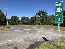 After a 1.99-mile (3.20 km) gap in the roadway, which consists of a former bridge over the Mullica River dismantled and moved to Virginia, bridges removed for wetlands mitigation in the marshes just north, and the orphaned roads in between (which are visible from the Garden State Parkway to the west), Route 167 resurfaces in Bass River Township as a short dead-end street only approximately 800 ft (0.24 km) long, serving only a few homes. The route intersects Bogan Lane and comes to an end at an intersection with US 9.[1] The route's official speed limit, which is not signed, is 25 mph (30 km/h) at its southern segment and 50 mph (70 km/h) in its northern segment.[2] However the Straight Line Diagrams produced by the Department of Transportation list both segments as 50 mph (70 km/h).[1]