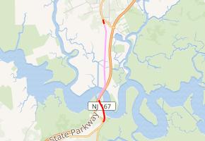Route 167 originates as a part of New Jersey Route 4 from Absecon to Rahway, designated in the 1920s.[3] The route remained intact for several years, receiving the co-designation of US 9 in 1926, when the nationwide system was assigned.[4] In 1927, the New Jersey State Highway Department had a statewide state highway renumbering, extending Route 4 in both directions.[5] The two routes remained intact until Route 4 was truncated to Bergen County during the 1953 state highway renumbering.[6]) The roadway itself remained until construction of the Garden State Parkway's tenth section from New Jersey Route 43 in Absecon to Dover Road in 1954. In August of that year, a bridge over the Mullica River for the Parkway, onto which US 9 was realigned, was completed, replacing the alignment over the old structure.[7][8] During construction, Route 4 and US 9 were realigned onto a temporary alignment to the older structure, while the old one remained unnumbered.[9]