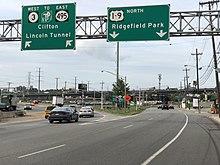 Following the 1929 amendments, Route 3 ran from Paterson along today's Route 20, through Clifton, Passaic, Wallington, Carlstadt, and East Rutherford along local streets, and finally down Paterson Plank Road (part of which is today's Route 120) to Secaucus.[9][10] Before 1938, a bypass around the original Paterson Plank Road bridge over the Hackensack River was built, parts of which were later incorporated into today's Route 120. As of this point, plans were in place to bypass the Plank Road to the north, going north of Wood Ridge and Wallington and replacing River Road up to Route 6, where it would rejoin the old alignment.[11] In 1939, Route 3 was extended east along present-day Route 495 to the Lincoln Tunnel into Manhattan.[12]