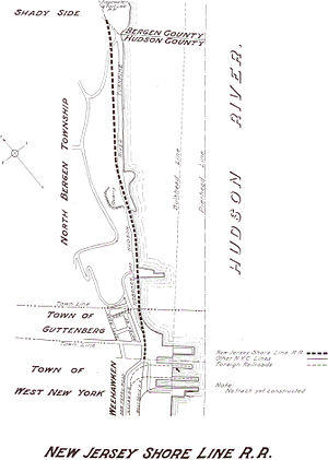 The New Jersey Shore Line Railroad was part of the New York Central Railroad and ran along the Hudson River in New Jersey, from the West Shore Railroad (NYCRR) yards at Guttenberg north to the Erie Terminals Railroad at the Hudson/Bergen County line.