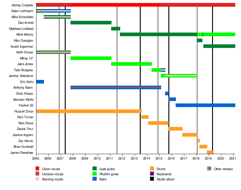From October to December, the band toured in support of Blood on the Dance Floor on the "All the Rage Tour".[11] Nikki Misery (born 1985) officially joined the band on this tour as its lead guitarist, replacing Matthew Lindblad who was more interested in pursuing a solo career. Nikki Misery was a recent graduate of Musicians Institute, hailing from Santa Ana with roots in New Orleans. His imposing looks, fierce chops and dramatic stage presence made him an immediate fan favorite.[12]