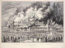 The New York Crystal Palace was destroyed by fire on October 5, 1858 during the American Institute Fair held there. The fire began in a lumber room on the side adjacent to 42nd Street. Within fifteen minutes its dome fell and in twenty-five minutes the entire structure had burned to the ground. No lives were lost but the loss of property amounted to more than $350,000. This included the building, valued at $125,000, and exhibits and valuable statuary remaining from the World's Fair.[6]