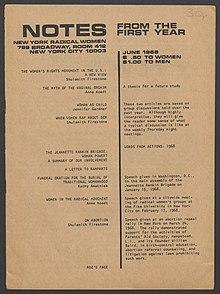 Notes from the First Year is based on speeches given by members and discussions held at the weekly meetings of the New York Radical Women in 1968. This pamphlet was part of a movement of mimeographed movement journals that coincided with the new radical feminism erupting in the United States.[15] Many pieces from this pamphlet were foundational in the development of what we now call women and gender studies.[16] The pamphlet notably marks the first appearance of the theory that would later grow into Anne Koedt's well-known pamphlet and book, The Myth of the Vaginal Orgasm.