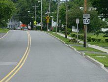 The first change to the routing of NY 10 came by 1926 when NY 10 was extended northeastward over modern NY 3 to Plattsburgh, where it terminated at NY 30 (now NY 22).[8] The route was truncated one year later when US 9W was assigned to the portion of NY 10 between New Jersey and Albany. NY 10 was subsequently truncated to the former western terminus of its overlap with NY 5 in Schenectady.[9] In the 1930 renumbering of state highways in New York, NY 10 was significantly reconfigured to begin in Deposit and end at the Canadian border north of Malone. The only segment of NY 10 not altered by the realignment, which utilized a combination of previously numbered routes and unsigned roadways, was the piece between Long Lake and Lake Clear Junction.[10]