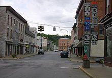Outside of Jefferson, NY 10 continues onward through rural Schoharie County, passing through only small roadside hamlets before entering the village of Richmondville, a community situated on NY 7 and the Cobleskill Creek. NY 10 bypasses the village to the southeast, however, and intersects both NY 7 and I-88, the limited-access highway that parallels much of NY 7, east of the village center. NY 10 turns east, overlapping NY 7 through the State University of New York at Cobleskill campus and into Cobleskill, where NY 7 and NY 10 intersect NY 145 at Grand Street. Here, NY 10, as well as NY 145 (which is concurrent with NY 7 east of this point), leave NY 7 and continue north for two blocks before NY 10 leaves NY 145 and heads west out of the village on Elm Street.[4]