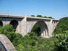 When it was first assigned, US 104 dipped south to serve downtown Rochester instead of bypassing it to the north. US 104 left Ridge Road at Lake Avenue and followed Lake Avenue and State Street south to Main Street in downtown. It followed Main Street and Winton Road to Empire Boulevard, where it turned east to rejoin Ridge Road in Webster.[31] It was rerouted c. 1937 to continue east on Ridge Road over the Veterans Memorial Bridge and through Irondequoit to Culver Road. US 104 turned here, following Culver Road south to Empire Boulevard and the latter east to Winton Road, where it reconnected to its original routing through the city. The realignment created a significant overlap with NY 18, which joined US 104 in the vicinity of Kodak Park and separated at Culver Road, where it headed north instead.[32][33]