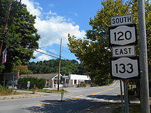 Roughly 1.5 miles (2.4 km) past the historic district, NY 120 makes a gradual turn to the west to reach a junction with NY 133 (Millwood Road). NY 120 turns onto NY 133, following Millwood Road westward into the hamlet of Millwood and its commercial center.[3] Here, the two routes cross the right-of-way of the former Putnam Division of the New York Central Railroad and pass by the site of Millwood's station, which was demolished in May 2012 after years of neglect.[8] Just after the railroad right-of-way, NY 133 turns southwestward onto Station Place while NY 120 proceeds northwest as Millwood Road for one more sparsely developed block before terminating at a junction with NY 100 (Saw Mill River Road) at the northern edge of the hamlet.[3]