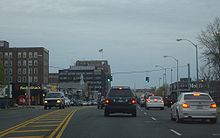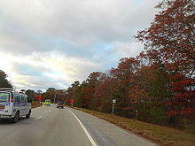 In Riverhead, NY 24 initially had a brief overlap with the northernmost portion of NY 113 between Riverleigh Avenue (NY 113) and Main Street (NY 25), where both terminated.[24] This concurrency was eliminated by 1970 as NY 113 was truncated to end at NY 24.[20] On July 1, 1972, NY 24 was extended westward along a new divided highway following the course of the Peconic River. The roadway began at the Long Island Expressway and ended just south of Riverhead.[20][25] This segment of NY 24 is maintained by Suffolk County and is co-signed as CR 94.[26] It is one of three locally maintained sections of NY 24; the others are in Queens, where the route is maintained by the New York City Department of Transportation (NYCDOT), and in the village of Hempstead, where the route is maintained by Nassau County as CR 107 from North Franklin Street to Truro Lane.[27][28][29]