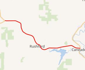 East of the hamlet, the highway runs generally eastward across another rural stretch, following the northern edge of Caneadea Creek as it connects to the southern terminus of CR 23 and the western end of CR 49. Not far from the latter junction, the creek empties into Rushford Lake, a small water body located on the Rushford–Caneadea town line. NY 243 loosely parallels the northern edge of the lake, serving several local roads that lead south to lakeside houses comprising the hamlet of Balcom Beach. Past the lake, the roadway heads eastward across an undeveloped part of the town of Caneadea, veering to the north and south as it runs along the base of several hills. NY 243 eventually enters the hamlet of Caneadea, where it crosses over an abandoned railroad grade before ending at a T-intersection with NY 19 in a residential area just west of the Genesee River.[3]
