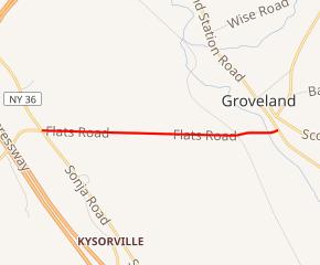 NY 258 begins at an intersection with NY 36 on the Groveland–West Sparta town line. The route heads eastward down a small hill, which leads to the flat terrain and open fields of the Canaseraga Creek valley that gives NY 258 the name of Flats Road. About 1.5 miles (2.4 km) east of NY 36, NY 258 crosses the Dansville and Mount Morris Railroad. East of the railroad crossing, NY 258 veers northeastward off the town line as it approaches the hamlet of Groveland Station. In its final 0.25 miles (0.40 km), the route passes over Canaseraga Creek and climbs slightly in elevation upon entering Groveland Station. NY 258 terminates in the center of the hamlet at a junction with NY 63.[4]
