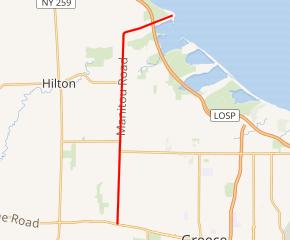 NY 261 continues northeast past the Lake Ontario State Parkway,[3] serving a line of homes overlooking Braddock Bay to the southeast, and eventually Lake Ontario to the east.[4] Until January 2017,[5] state maintenance of NY 261 ceased just northeast of the junction with the parkway, at which point it became county-maintained as the unsigned CR 272.[6] Roughly 0.5 miles (0.8 km) northeast of the Lake Ontario Parkway, NY 261 reached the lakeside hamlet of Manitou Beach. The route turned southward before reaching the lake shore, however; instead, it parallels the shoreline for 200 yards (183 m) before terminating at an isolated dead end south of the hamlet.[3][4]
