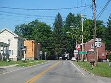 At the southern end, NY 315 begins in Waterville at an intersection with NY 12. Paralleling Big Creek, the route heads northwestward through mostly rural and residential land. The route, locally known as Buell Avenue along this stretch of its source, crosses several of the creek's tributaries as it progresses towards the hamlet of Deansboro, where it bends slightly westward and uneventfully terminates at NY 12B.[3] Approximately midway between Waterville and Deansboro is Forge Hollow. Here, the road makes an S-shaped turn around Big Creek and one finds a rock face with caves and a natural spring. The entire route is five miles long.