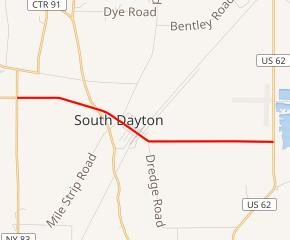 In South Dayton, NY 322 is known as Pine Street as it proceeds through the village. The amount of development along the route rises as it approaches the center of the village at Main Street. The route continues on, traveling by four blocks of homes and businesses before curving eastward and entering another area dominated by open fields. It exits the village limits shortly afterward. East of South Dayton, NY 322 is known as Dexter Corners Road as it heads through a rural area of the town of Dayton. NY 322 continues to the community of Dexter Corners, where it ends at an intersection with US 62.[4]