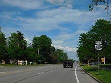NY 324 crosses its last major route, Transit Road (NY 78), on an overpass just north of the once-thriving Eastern Hills Mall, which had been the premier mall in the Buffalo area until it began losing tenants and customers to the larger Walden Galleria in Cheektowaga. Beyond Transit, the road is still four-lane but primarily residential as it enters the Town of Clarence. After Harris Hill Road, the highway bends to the southeast once again for a final mile into its eastern end at Main Street (NY 5). This last section was widened from two lanes to four in the mid-1990s, and has seen some development but still remains lightly trafficked most of the day.[5]