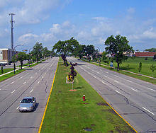 Sheridan Drive was constructed during the early 1920s as a town of Tonawanda project to help alleviate the anticipated growth of the village of Kenmore. Despite its construction, the new road was not without controversy. During construction, new traffic lights were put in with concrete supports were opposed heavily by the town of Tonawanda and its residents, resulting in the traffic lights not having been built for many years.[8] The town also felt that the construction of a superhighway in the middle of the country in Tonawanda was unjustified with the average traffic in that area.[8] After construction of Sheridan Drive was completed in 1925, a monument with a statue of General Phillip Sheridan was constructed to commemorate the new road. However, the taxpayers feeling enough money had already been spent on the road, the statue of Sheridan was never constructed and only the monument to the road's construction was completed.[9] In order to give the road a new look, the road had large trees planted throughout what was considered a desolate area at the time.[10]