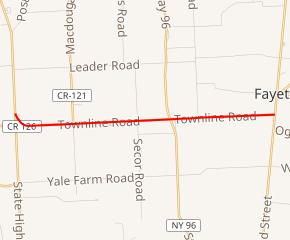 NY 336 begins at an intersection with NY 96A in a rural, open area of the town of Fayette. The two-lane route heads to the southeast, passing a small number of commercial buildings on the corner of the junction before heading across rolling, undeveloped terrain. After about 0.25 miles (0.40 km), NY 336 merges with Yale Station Road (unsigned County Route 126 or CR 126), here routed along the Fayette–Varick town line. At this point, NY 336 becomes known as Townline Road as it turns east to run along the town line. It passes a handful of isolated homes on its way to the hamlet of MacDougall, a small community built up around the junction of NY 336 and MacDougall Road (CR 121).[4]
