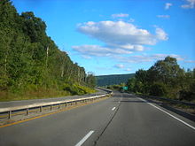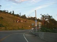 A bypass for NY 17 in the Elmira area was built in the 1950s. The first section from Horseheads south to the eastern fringe of downtown Elmira was completed in the mid-1950s, resulting in a short eastern extension of NY 17E to the east side of Newtown Creek (exit 56).[10][11] The second half of the bypass, from East Corning eastward to Horseheads, was open by 1958, and NY 17's original alignment from East Corning (exit 48) to Big Flats became a western extension of NY 17E.[12] In October 1966, under pressure from locals to eliminate confusion between NY 17 east and NY 17E, the latter was renumbered to NY 352.[1]
