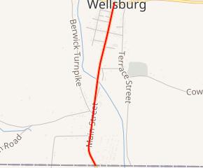 NY 367 begins at the Pennsylvania state line at Wellsburg,[3] where the route connects to Berwick Turnpike, a highway designated but not signed as SR 4013, one of Pennsylvania's quadrant routes.[4] The route heads north from the state line as Main Street, proceeding north through the southern portion of the village and intersecting a local street named Doty Hill Road. Not far to the north, Berwick Turnpike leaves to the northwest while NY 367 makes a slight turn to the northeast.[3]
