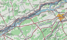 In the 1950s, construction began on the St. Lawrence Seaway, a system of canals and locks that would make the St. Lawrence River suitable for shipping.[13] As part of the seaway's construction, a low-lying area in Ontario and New York between Waddington, New York, and Cornwall, Ontario, would be inundated with water in order to create a navigable channel through the Long Sault rapids and to allow hydroelectric stations to be established immediately upriver from Massena and Cornwall.[14] Much of NY 37B was located within the flood-prone region due to its proximity to the river.[10] On July 1, 1958, the intentional flooding was carried out via the destruction of a cofferdam upstream, creating what is now known as Lake St. Lawrence[14] and inundating the majority of NY 37B west of Massena.[11][15]