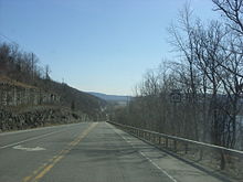 The route continues on, meeting the Southern Tier Expressway (STE) at exit 46. The composition of the exit's ramps is unorthodox in that the westbound on-ramp for I-86 and NY 17 is about 0.25 miles (0.40 km) north of the remainder of the interchange. This layout is caused by several factors, including a nearby wye connecting two Norfolk Southern Railway lines—the east–west Southern Tier Line and the north–south Corning Secondary. Another is the alignment of the STE itself, which runs in close proximity to NY 414 for a short distance as it bypasses northern Corning while avoiding the hilly terrain north of the city. North of the STE, the amount of development along the highway significantly decreases as it follows the Corning Secondary northeastward into the mountains that surround the city of Corning.[4]