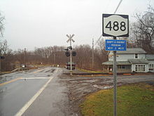 NY 488 begins at an intersection with NY 21 in the hamlet of Chapin, a small community within the Ontario County town of Hopewell. The highway progresses eastward, crossing the Finger Lakes Railway at a grade crossing less than 100 yards (91 m) from NY 21. Just past the railroad, the route makes a slight turn to the northeast for 0.25 miles (0.40 km) before curving back to the east and continuing across open farmland. As NY 488 crosses the town of Hopewell, it serves a handful of isolated homes and intersects several north–south highways of local importance, including County Road 47 (CR 47). The route continues eastward into the town of Phelps, where it serves a pair of large farms on its way to the small hamlet of Orleans,[3] located on both the western bank of Flint Creek and the right-of-way of the now-defunct Pennsylvania Railroad (PRR).[4]