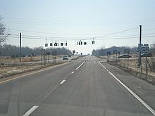 Directly south of Spencerport, NY 531 encounters South Union Street (NY 259) by way of a diamond interchange bordered on both sides by small housing tracts. The roadway continues eastward, reentering open and mostly undeveloped areas of the town. It heads past farmland for 2 miles (3.2 km) before turning southward a short distance east of an overpass carrying Gillett Road. NY 531 proceeds due south for 0.75 miles (1.21 km), passing over Lyell Road at the midpoint of the segment, before returning to an east–west alignment just ahead of the Manitou Road exit, where NY 531 crosses into the town of Gates.[3]