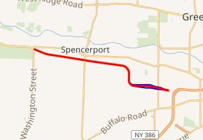 West of NY 386, the expressway expands to three lanes eastbound as it leaves the heavily commercialized and industrialized area around Elmgrove and Manitou Roads and enters a narrow, wooded area bordered by homes to the north. Not far to the east, NY 531 comes to an end at a slightly modified directional T interchange with I-490. Heading eastbound, the two leftmost lanes connect NY 531 to I-490 eastbound while the right lane links to I-490 westbound 0.25 miles (0.40 km) north of I-490's modified cloverleaf interchange with NY 33.[3]