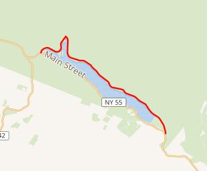 NY 55A begins at an intersection with NY 55 in the town of Neversink, just east of the hamlet of Grahamsville. NY 55A proceeds northeast through the Catskill State Park, and alongside Chestnut Creek, before bending eastward through Neversink. NY 55A remains mostly wooded as it begins running alongside the Rondout Reservoir as a two-lane road maintained by New York City. Passing south of several residences, NY 55A makes a gradual bend alongside the reservoir, making a stretch north past some reservoir facilities before intersecting with BWS Road, a connector to County Route 153 (CR 153; Sundown Road), which heads north to Sundown in Ulster County. At this junction, NY 55A crosses over a segment of the Roundout Reservoir and heads southward through Neversink.[4]