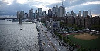 The proposed congestion pricing zone was defined as the island of Manhattan, bordered by the East and Hudson Rivers south of 60th Street. The northern border of the congestion zone was originally slated to be 86th Street, but this changed after the commission's recommendation released on January 10, 2008.[41] Exempted roadways within the zone include the FDR Drive, New York Route 9A (West Side Highway and Henry Hudson Parkway included), the Battery Park Underpass, and the East River bridges (Queensboro Bridge, Williamsburg Bridge, Manhattan Bridge and Brooklyn Bridge) and their approaches. A free route from the East River bridges to the FDR Drive and from the Lincoln and Holland Tunnels to Route 9A would be designated.[27]:143–144 Drivers who use toll crossings to or from the zone (e.g. Brooklyn-Battery Tunnel and Queens-Midtown Tunnel) would be charged the difference between the toll and the congestion charge.[19]