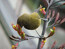 Bellbirds feed on nectar, fruit and insects. Insects are important for females and their chicks during the breeding season. As honeyeaters, with brush-tipped tongues that enable them to sip nectar and the honeydew found on the trunks of beech trees,[6] they play an important part in pollinating numerous native plants such as mistletoe, fuchsia, and kowhai.[7]